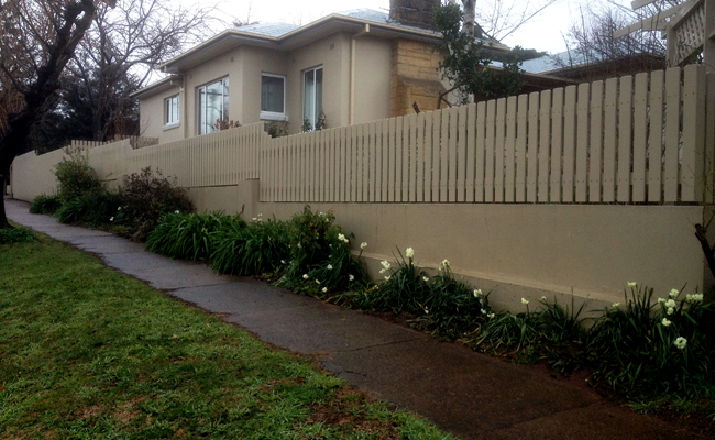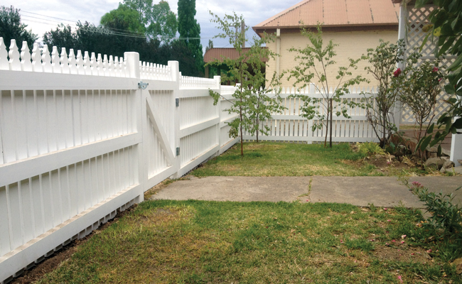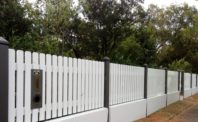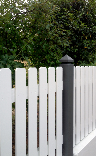 A Timberwood Picket Fence is a choice for a front footpath fence with an ornate and traditional timber look and is offered in powder coated steel posts or dressed and champhered Cypress timber posts.
